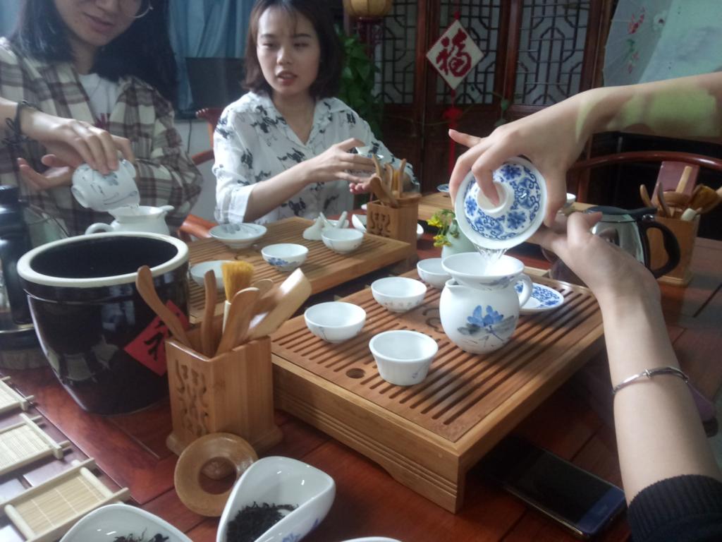 下午2点25分,老师同学们一走进教室,整个教室明亮淡雅,充满了文化的韵味。古色古香的木桌和木椅,精致柔美的茶具,让人一走进教室便不禁觉得心旷神怡。