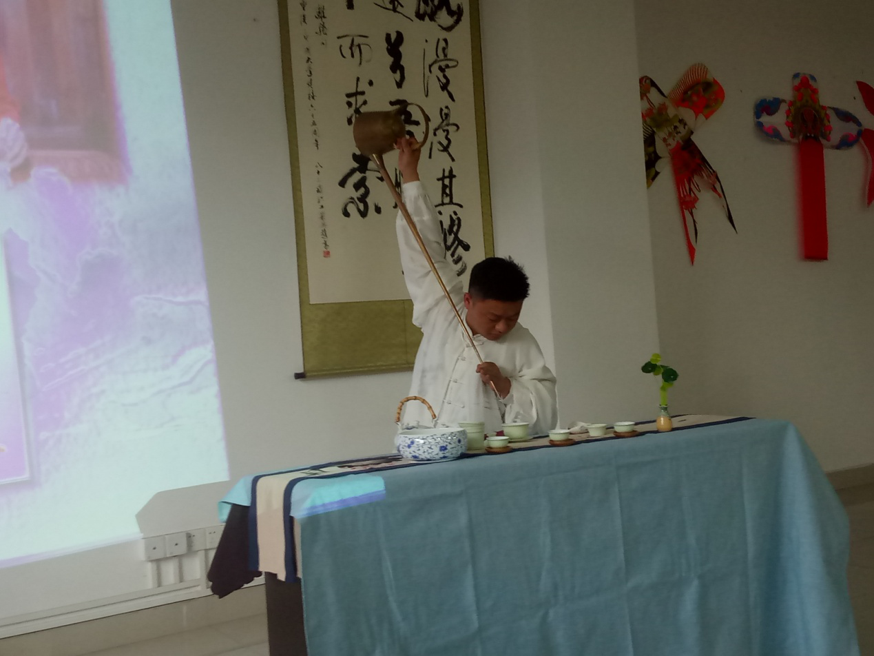 在老师讲解茶文化的同时,还让同学们品尝了不同茶类的不同味道。同学们端起茶,一则观色,二则轻嗅,三则三口而饮。我们品尝了绿茶的清香中略带的苦涩;白茶的甘醇爽口;黄茶和绿茶比,少了一份苦涩,多了一份甘甜。而后第二阶段,则由陈老师为大家带来茶艺的表演。在古色古香的音乐中,陈老师飘逸的身姿将长嘴壶使得是精彩绝伦,让人不禁感慨起茶艺的美好。这个中滋味,只有身临其境方能体会到茶艺的美妙。
