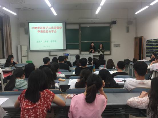 学姐房雅首先上台开始分享,以个人经历为例,层层阐述了自己的CIMA学习之路,其中重点讲述了CIMA课程及考试的学习小tips。此外,她对大家简要提出了“提早规划、合理安排、重视GPA”三点主要建议。接着便是学姐李思嘉上台详细地介绍关于出国留学的问题,包括留学申请流程等事项,并在留学益处方面发表了自己独到的见解。