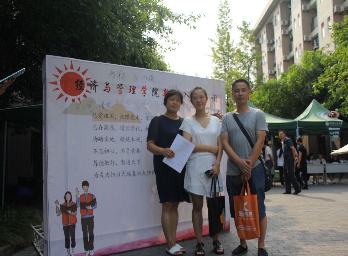 | 新生及其家长于宣誓板前留影 |