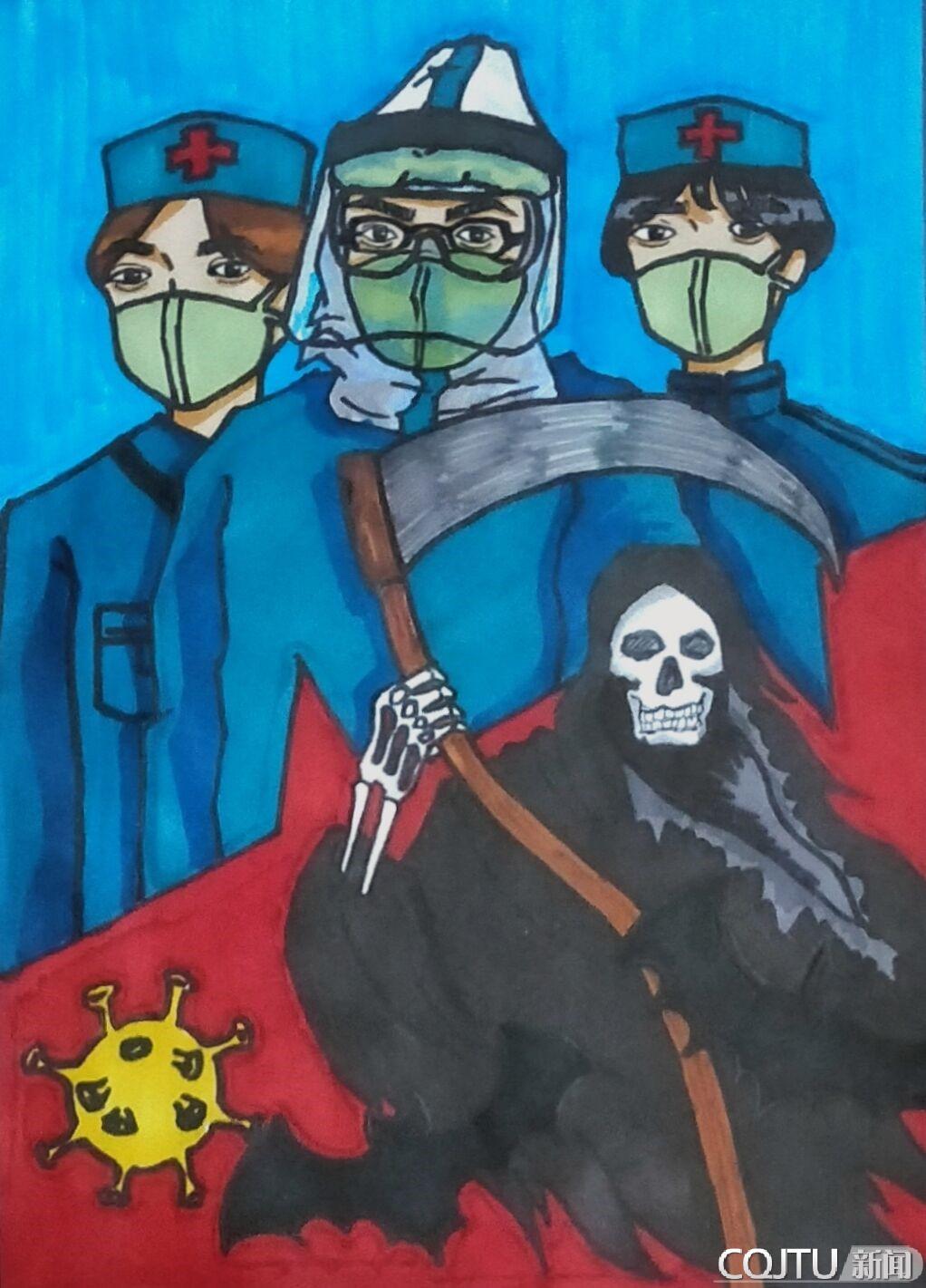 图为廖祎娴创作抗疫漫画《与病魔较量》 |