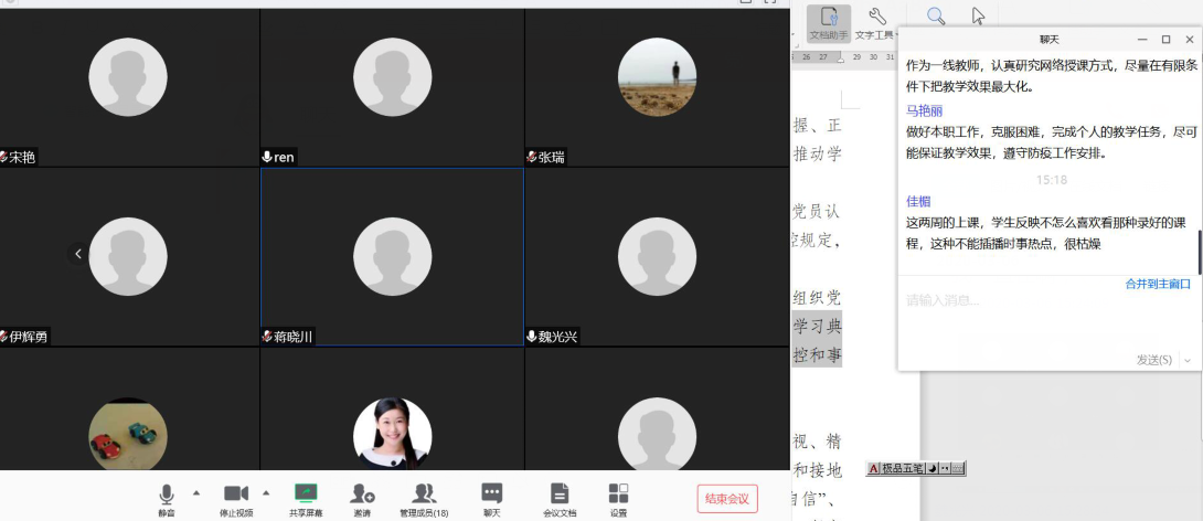 克服困难,确保教学。对于疫情期间教学过程中遇到的网络技术、员工考核等问题进行探讨。支部全体教师党员结合自己的教学经验,互相给出网络教学建议,共同商讨解决办法。