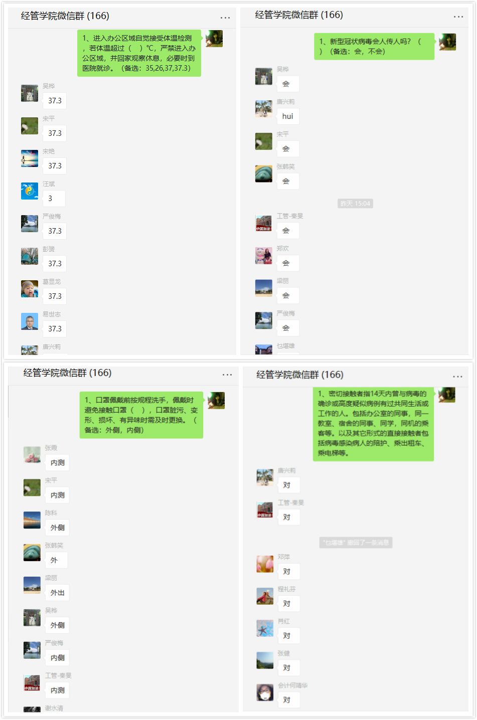 本次活动通过公司QQ群和微信群进行,采用在线抢答的方式促进教职工对新冠疫情防御知识的了解。活动中,广大教职工积极参与,热闹非凡,趣味性、知识性相结合,不仅了解了疫情防御的常识,还进一步调动广大女教职工的积极性和创造性。公司为这次活动专门准备了口罩作为奖品,还给每位参加活动的女教职工准备了小纪念品,活动中充满了节日的氛围。