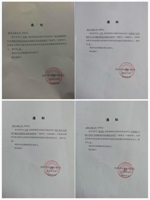 近日,公司收到国家自然科学基金委员会管理科学部下发的通知书,suncitygroup太阳新城4个基金项目在基金委组织的结题绩效评估中获两“优”两“良”的好成绩。其中,李豪教授承担的《面向策略乘客行为的航空客运动态定价策略及应对机制研究》项目和王勇教授承担的《生鲜农产品冷链多中心共同配送收益分配优化研究》项目被评为“优”,闫芳副教授承担的《基于竞合关系的不确定运输服务采购决策研究》项目和刑青松副教授承担的《专利保护下客户协同产品创新效率及协调优化研究》项目被评为“良”。
