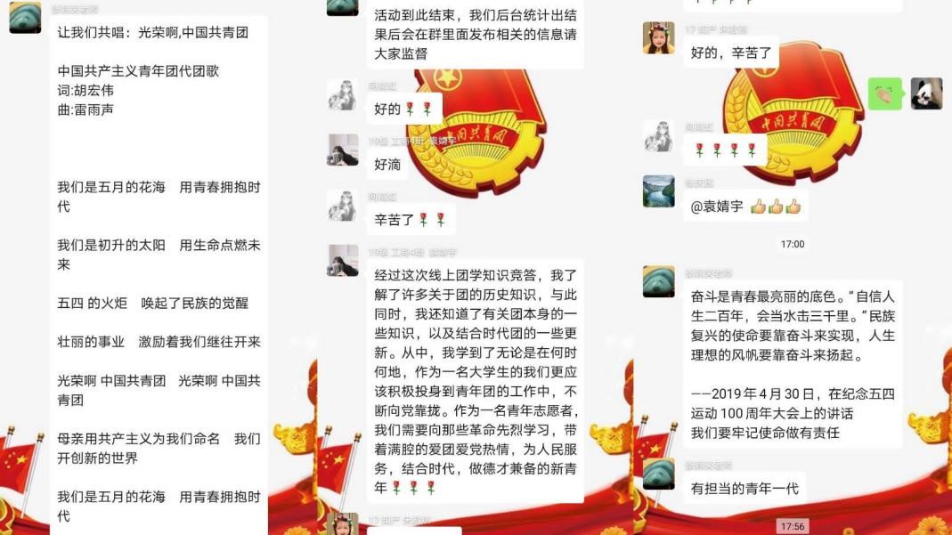 下午,部分同学又来到公司为大家准备的“争做新青年”的团学知识竞赛微信群,群里进行了隆重的线上合唱团歌仪式,回味共产主义青年团的历史和解读习近平总书记寄语新时代青年奋进方向。竞赛正式开始后,大家就团史、团章、习近平总书记对青年老员工讲话精神等内容踊跃发言,积极线上抢答。袁婧宇同学在答题中表示:“作为一名青年志愿者,我们需要向革命先烈学习,带着满腔的爱团爱党热情,为人民服务,做德才兼备的新青年。”