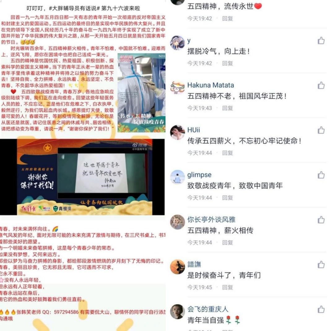 夜晚月光曲飘荡的时候,经管青年们开始了“大胖老师侃大山”的每日疫情关注与疫情防护小知识。今天是一篇关于传承五四精神和青年抗疫的文章,文章中写到“迎难而上,逆风飞翔,愿你在困境中也把自己活成一束光”,这让阅读的经管青年们感触颇深,并留言“五四精神,薪火相传”“传承五四薪火,不忘初心牢记使命”。