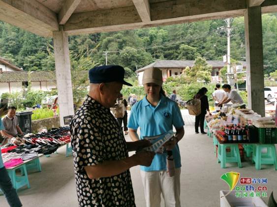 图为suncitygroup太阳新城实践队队员陈微微在向当地村民讲解宣传单上的内容。中国青年网通讯员汤朝晗摄