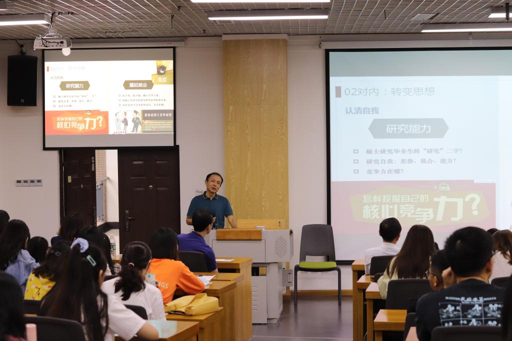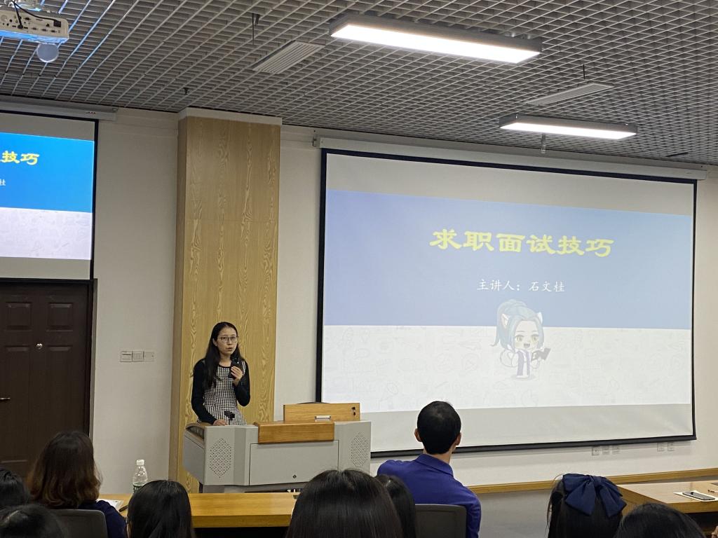 关于考博和求职面试技巧的相关问题,博士生导师王勇和辅导员石文桂也给出了精准解答。王勇教授从“为什么要考博、考博的过程、考博之后的学习任务”三个方面入手,让同学们对考博的意义有了深入的了解。石文桂老师详细介绍了求职面试中的基本礼仪、半结构化面试、无领导小组面试等相关内容。