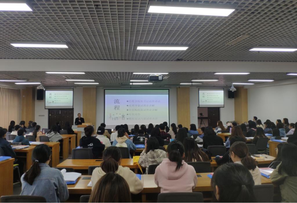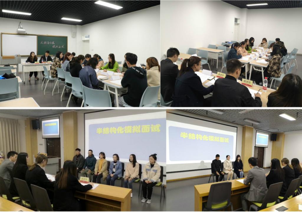 面试理论培训结束后,立即进行了实战练习——全真模拟面试。为了还原真实的面试场景,模拟分为无领导小组面试和半结构化面试两个环节,每个环节安排4位面试官,逐一提问和打分,同学们都积极踊跃参与,认真思考和回答每一个面试题目。模拟面试结束后,考官就每一组同学的表现进行一一点评,并针对大家在面试表现中的不足提出了改进建议。