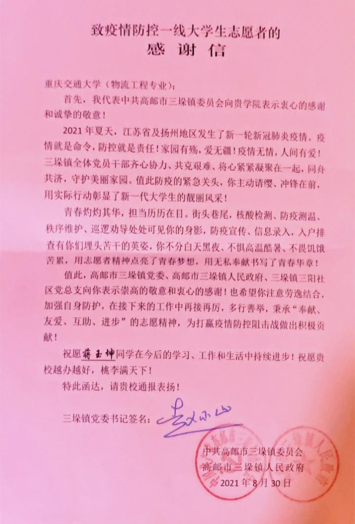 2021年8月初,江苏扬州新冠疫情突发,公司suncitygroup太阳新城19级员工蒋玉坤在返乡期间积极参与当地社区新冠疫情防控工作,为守护家乡人民群众的健康安全做贡献。