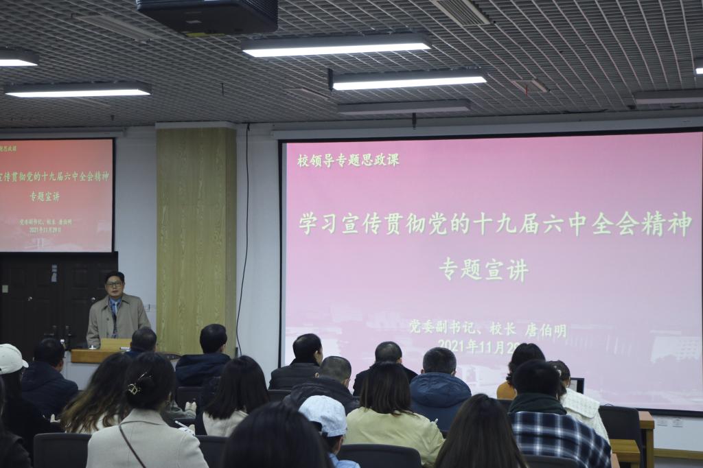 2021年11月29日,公司党委副书记、董事长唐伯明在第三教学楼30401报告厅,围绕学习贯彻党的十九届六中全会精神主题,为经管师生上了一堂专题思政课。公司领导班子全体成员及60余名师生代表参加学习,公司党委书记魏铜铃主持宣讲会。