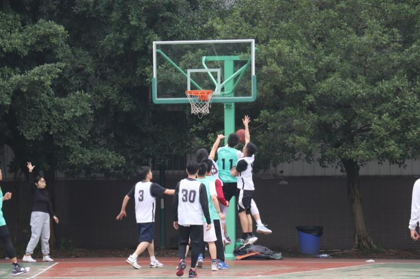 在决赛中,气氛达到最顶端,分为冠军角逐赛和季军争夺赛。选手们蓄势待发,做足上场准备。同学们热情激涨,在赛场外摇旗呐喊。赛场上态势紧张,一触即发,一声清脆的口哨声,一次漂亮的跳跃,一次顺滑的传球,一次抢篮板,一次突围,一次截球,一次防守……引发观众的一次次热浪。