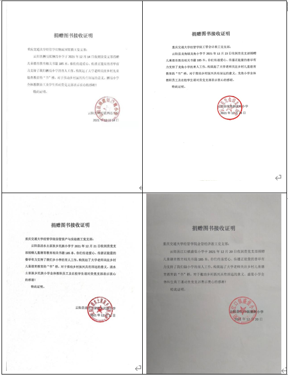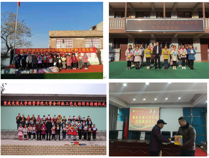 此项活动于2021年11月中旬开始筹划,在公司驻村书记樊信友、罗丙军、束海波和邓光荣协调下,截至12月下旬,物流国贸教工党支部、工管会计、信管知产、企管经济教工党支部陆续为云阳县栖霞镇栖霞小学、龙角镇龙角小学、清水镇土家族乡民族小学和江口镇盛堡小学捐赠德育读物共计740余本,构筑交大老师关注乡村儿童德育教育的“书”桥,通过育德强智积极服务乡村振兴。