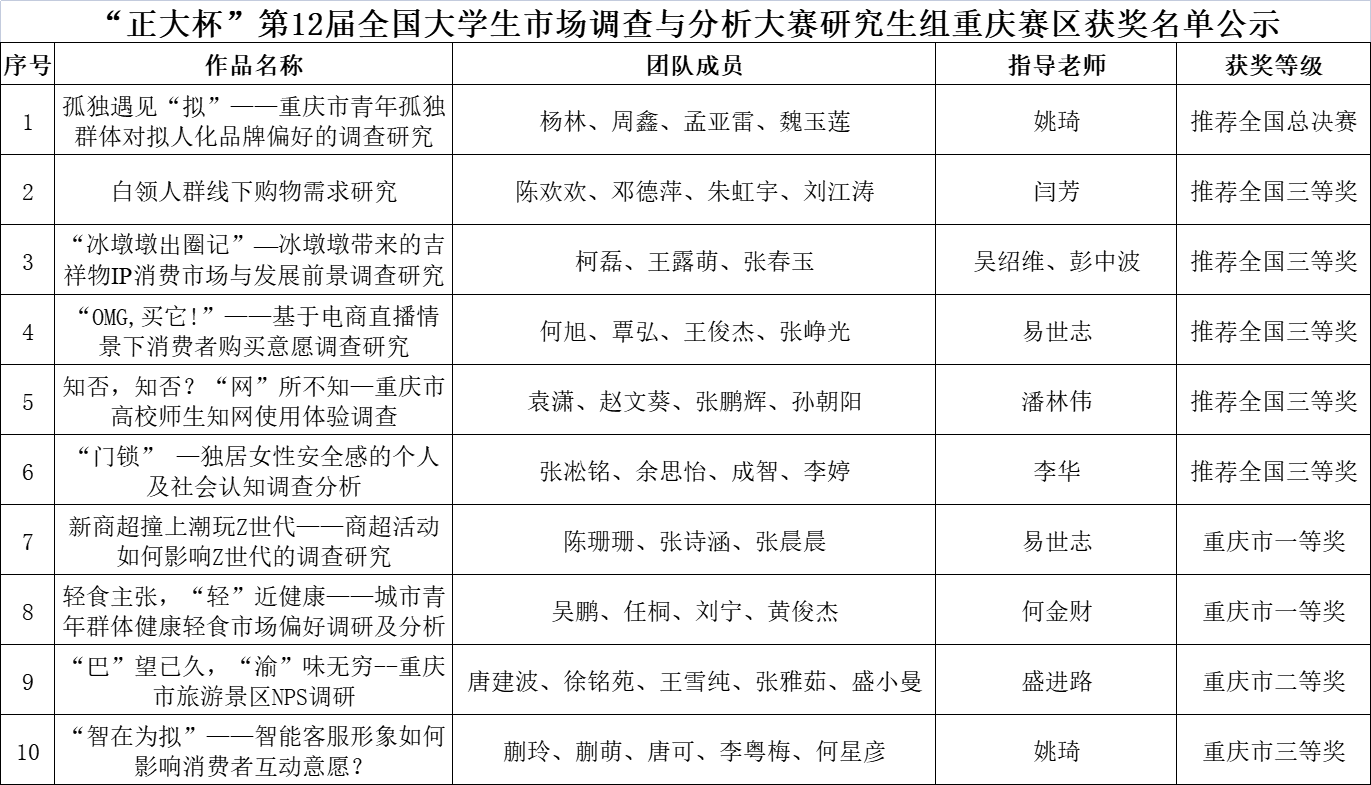 据悉,2022年第12届全国老员工市场调查与分析大赛研究生组重庆赛区参赛队伍共计46支,分别来自西南大学、重庆大学、重庆工商大学、suncitygroup太阳集团、重庆科技公司、重庆三峡公司、重庆医科大学和重庆师范大学,经过作品评审和答辩比赛,最终推荐5支队伍参加全国总决赛。该项赛事是政府支持、企业认可、高校师生积极参与、海峡两岸高度联动的统计学科实践教学平台赛事,为高校学科竞赛排行榜竞赛项目。