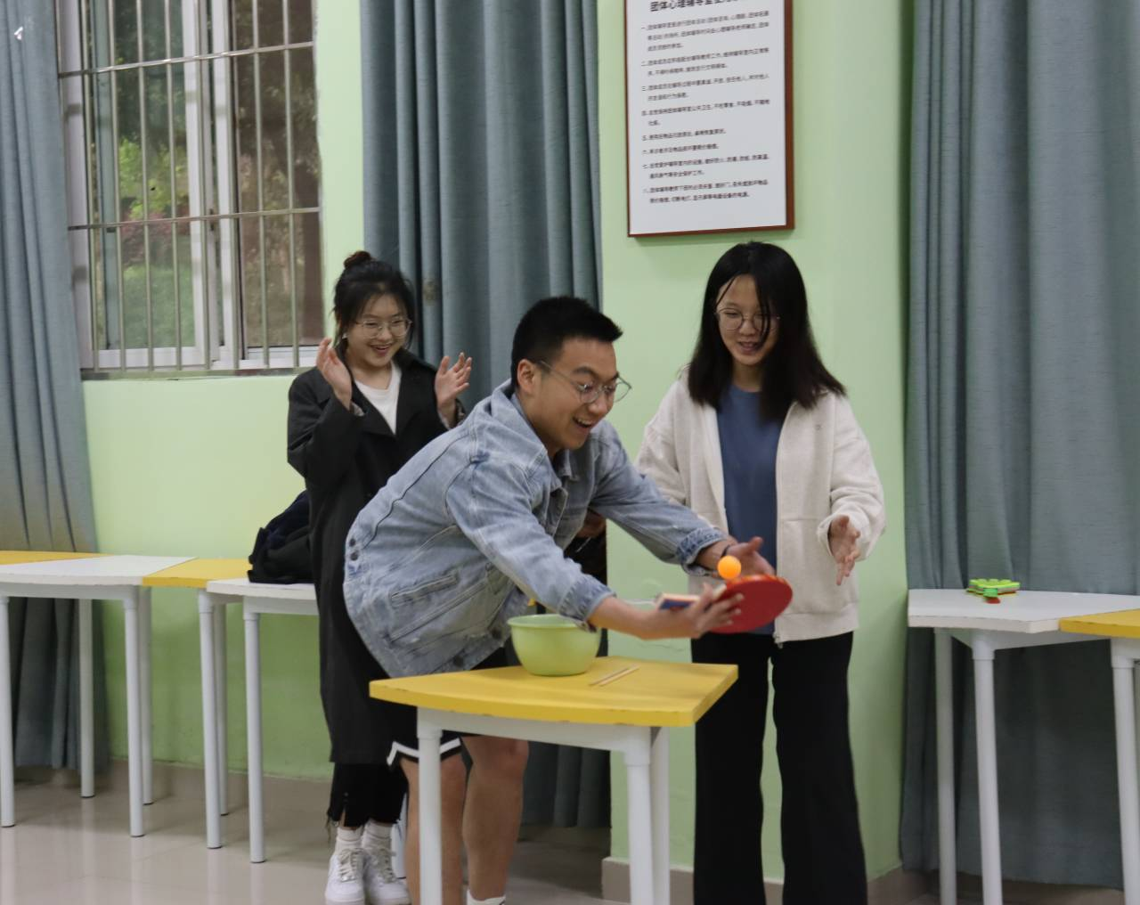 活动组织了“乒乓球大赛”:“盆里捞月”夹球游戏、“精准进篮”投球游戏、“搬运接力”运球游戏。通过随机形式将报名的同学分为两组,每组五人,完成三个环节用时少的队伍获胜。