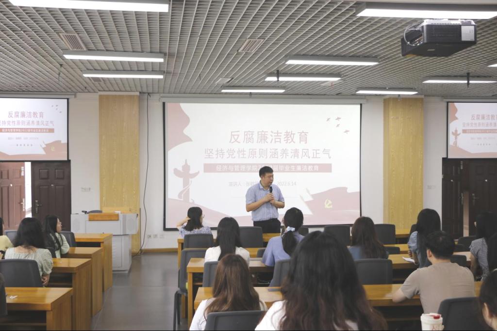 本次毕业生党员廉洁教育以“坚持党性原则涵养清风正气”为主题,张韩笑同志带领大家回顾了党性原则历史渊源,学习了党性原则基本内涵,认识了了坚持党性原则的极端重要性与现实针对性。