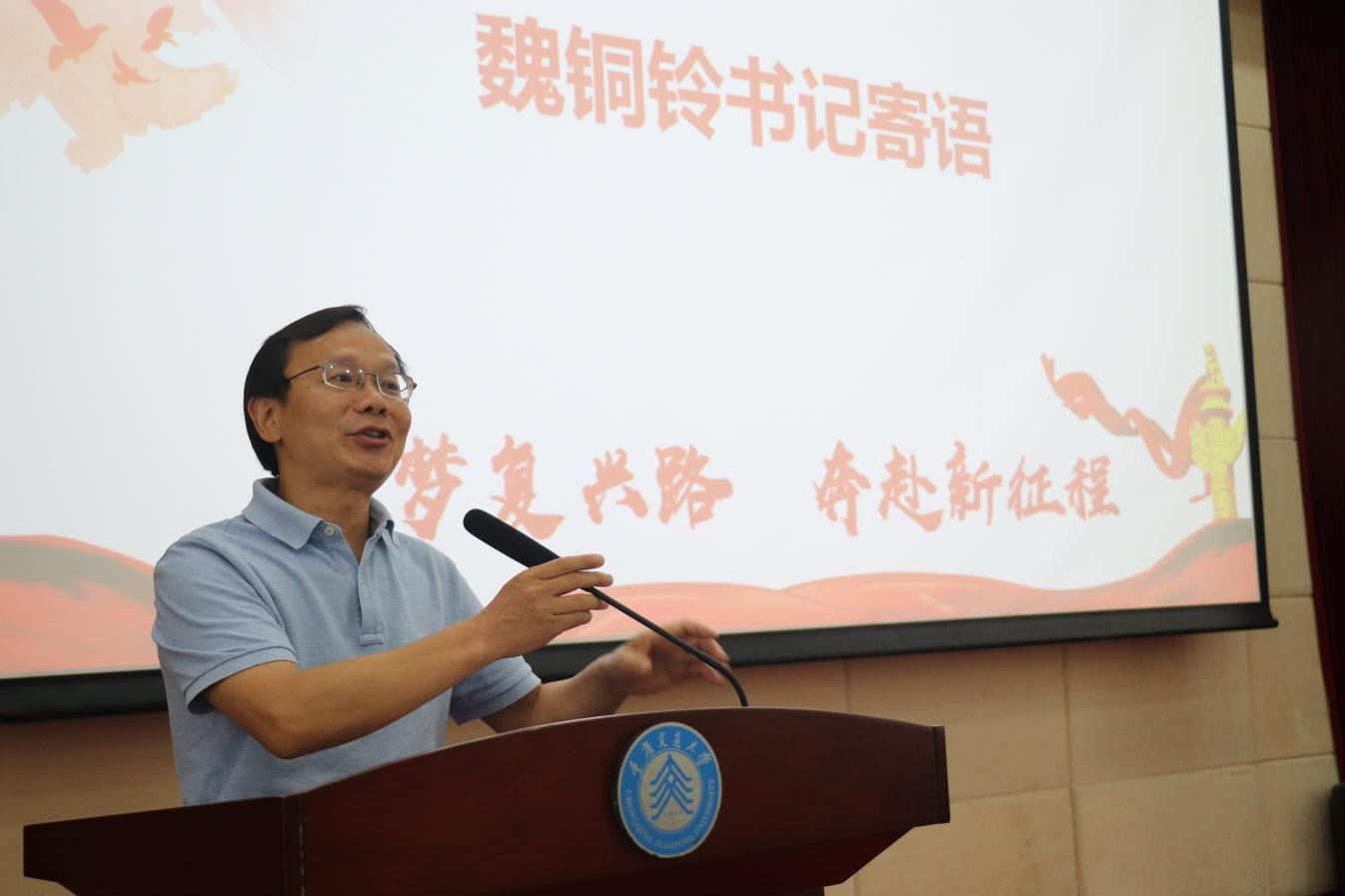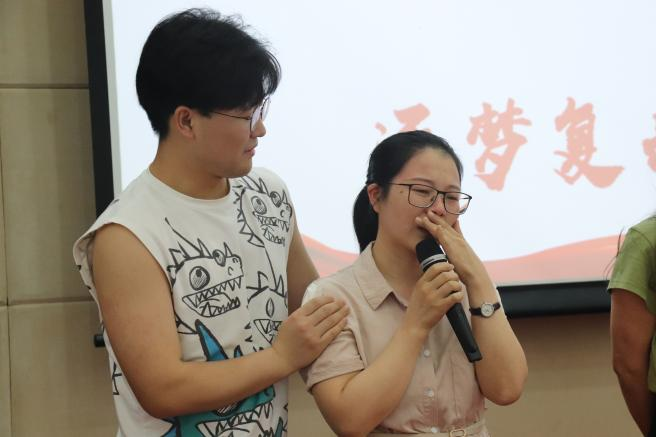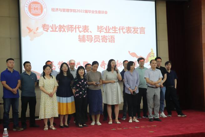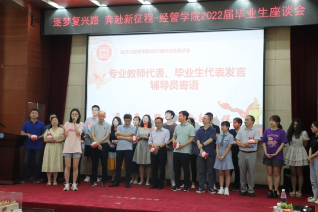座谈会大屏幕展示着毕业生的风采。二十多位教师代表、全体毕业班辅导员激情登台,为同学们送上最美好的祝福和最深切的寄语,献唱送别歌,给予同学们热情鼓励,上了生动的最后一节课。辅导员谢吉琴、任为新等老师还激动地洒下热泪。