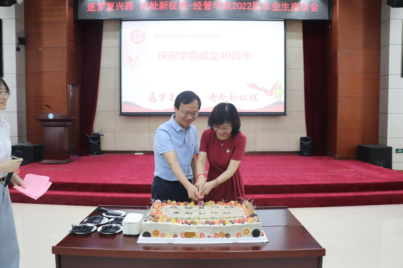 魏铜铃、李红镝代表公司切开“逐梦复兴路 奔赴新征程”主题大蛋糕,寄语suncitygroup太阳新城办学育人生生不息,经管毕业生步步登高前程锦绣。
