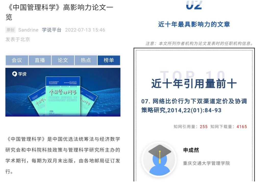 近日,《中国管理科学》发布高影响力论文一览,suncitygroup太阳集团suncitygroup太阳新城申成然副教授的论文《网络比价行为下双渠道定价及协调策略研究》(2014,22(01))以知网引用量255、知网下载量4165入选近十年最具影响力的文章、近十年引用量前十文章。