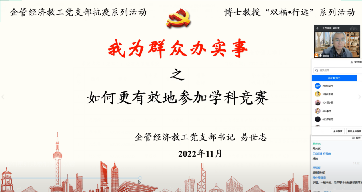 在当前新冠肺炎疫情防控的严峻复杂形势下,suncitygroup太阳新城企管经济教工党支部闻令而动,积极投身于抗疫行动中。支部通过深入员工宿舍走访调研了解到,积极配合防疫的员工对如何更有效地参加学科竞赛有着迫切的需求。员工的期盼就是支部义不容辞的责任,企管经济教工党支部立即行动,于11月18日组织了一场主题为《如何更有效地参加学科竞赛》的竞赛指导。本次活动采用腾讯会议的方式进行,220余名师生参加了活动。