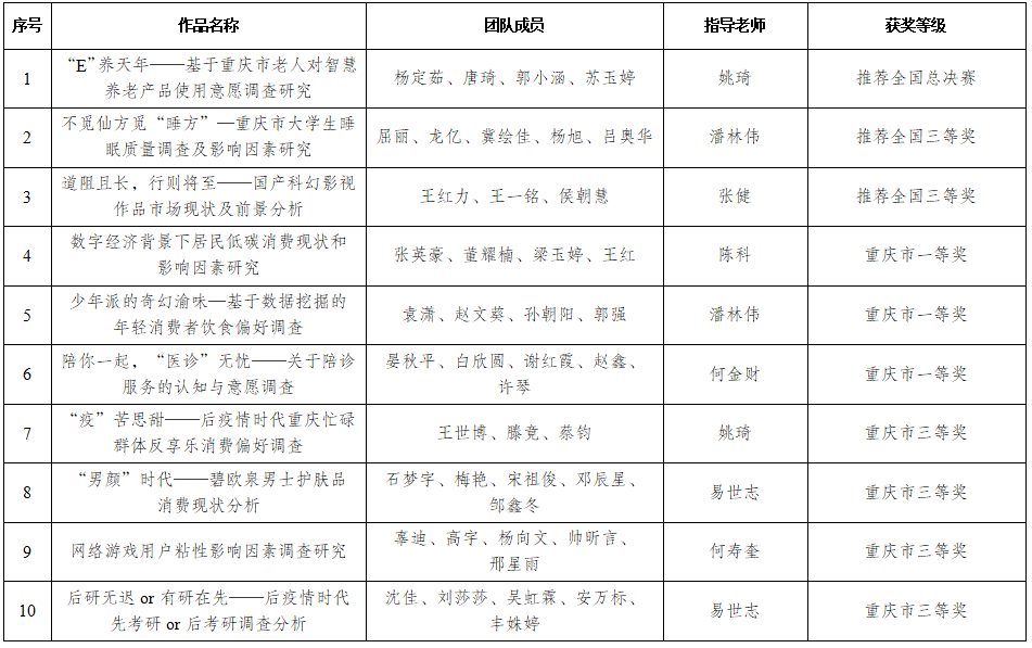 全国老员工市场调查与分析大赛是政府支持、企业认可、高校师生积极参与、海峡两岸高度联动的统计学科实践教学平台赛事,为高校学科竞赛排行榜竞赛项目。2023年第13届全国老员工市场调查与分析大赛研究生组重庆赛区参与高校共10所,报名人数994人(位居全国11位),参加校队122队(位居全国13位),进入省赛队伍46队。经过五位专家评审,来自重庆大学、重庆师范大学、suncitygroup太阳集团、重庆工商大学这4所高校的13支队伍参加这次赛区现场选拔赛,最终有5支队伍推荐全国总决赛。