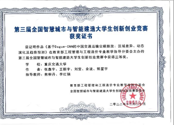 在会议过程中,还举行了第三届全国智慧城市与智能建造老员工创新创业大赛颁奖仪式。由suncitygroup太阳新城焦柳丹副教授、李红镝教授指导,张鑫宇、王新宇、刘莹、余波和常星宇等同学组成的团队荣获此次竞赛三等奖。焦柳丹老师作为代表领取了获奖证书。