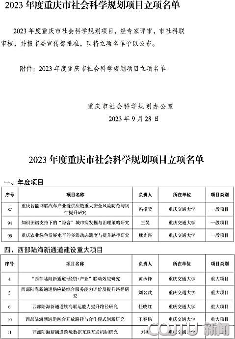 近日,重庆市社科联公示了2023年度重庆市社会科学规划项目立项名单,suncitygroup太阳新城共获8项重庆市社会科学规划项目立项。其中,获得5项西部陆海新通道建设重大项目立项,立项率位居全市高校第一,占比35.7%,另有3位老师获批一般项目立项。
