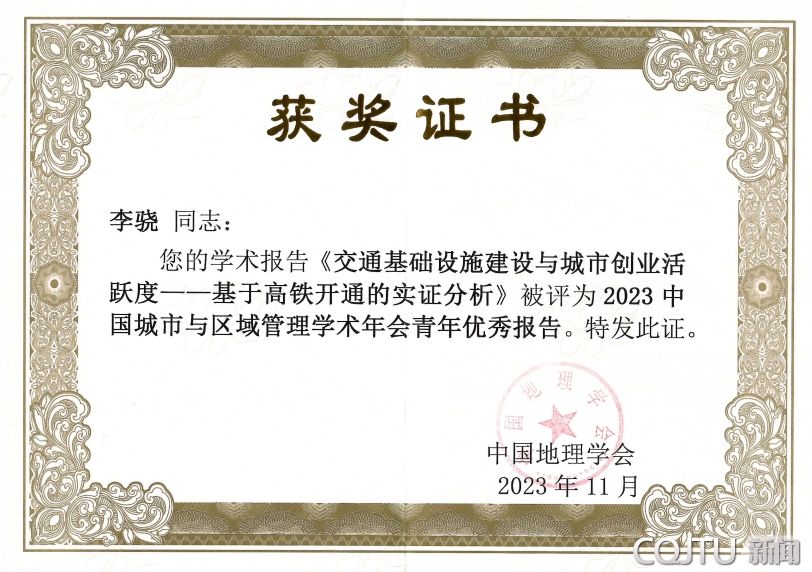 交通运输经济专业研究生李骁在专题分会场“要素流动与区域一体化发展”上做了主题为“交通基础设施建设与城市创业活跃度——基于高铁开通的实证分析”的学术报告,提交的论文在57篇参评论文中脱颖而出,获得了2023中国城市与区域管理学术年会青年优秀报告奖。