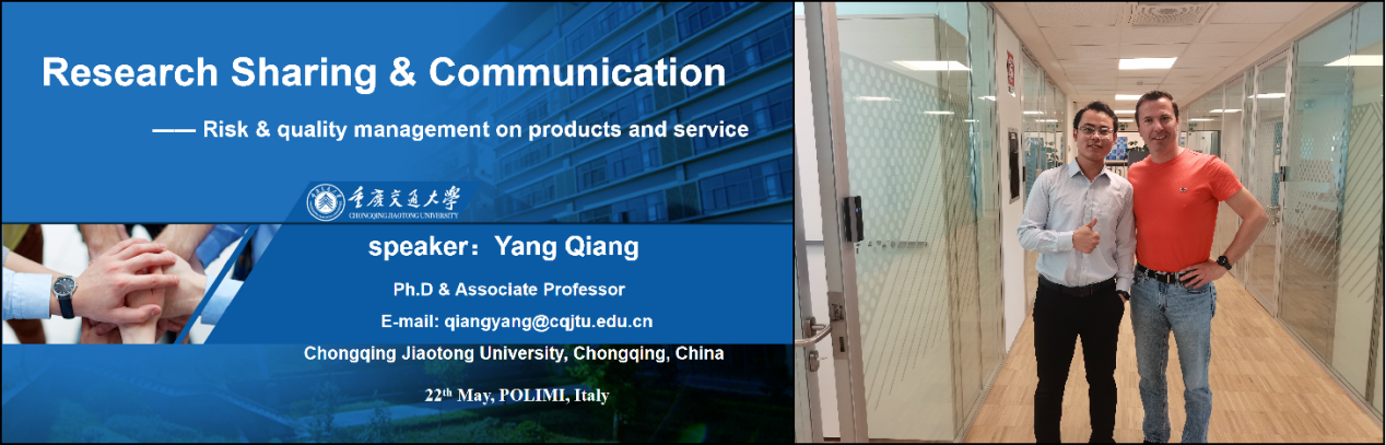 5月22日,suncitygroup太阳新城青年教师杨强副教授在意大利米兰理工大学访学期间,受邀与米兰理工大学管理公司 Guido Jacopo Luca Micheli教授开展学术交流活动。交流期间,杨强副教授以《Risk & quality management of products and service》为题向Micheli教授介绍了其团队的前期科研成果,并针对供应链风险管理主题进行了深入研讨,双方就未来开展合作研究达成一致意愿。