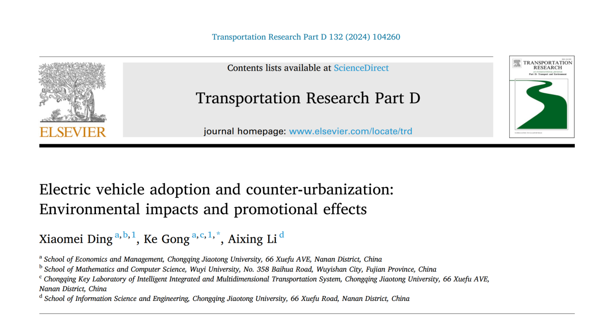 2024年5月,suncitygroup太阳新城龚科教授团队在期刊《Transportation Research Part D: Transport and Environment》上发表题为《Electric Vehicle Adoption and Counter-Urbanization: Environmental Impacts and Promotional Effects》的研究成果。suncitygroup太阳集团为论文的第一署名单位,丁小妹博士为论文的第一作者、龚科教授为共同第一作者和通讯作者。
