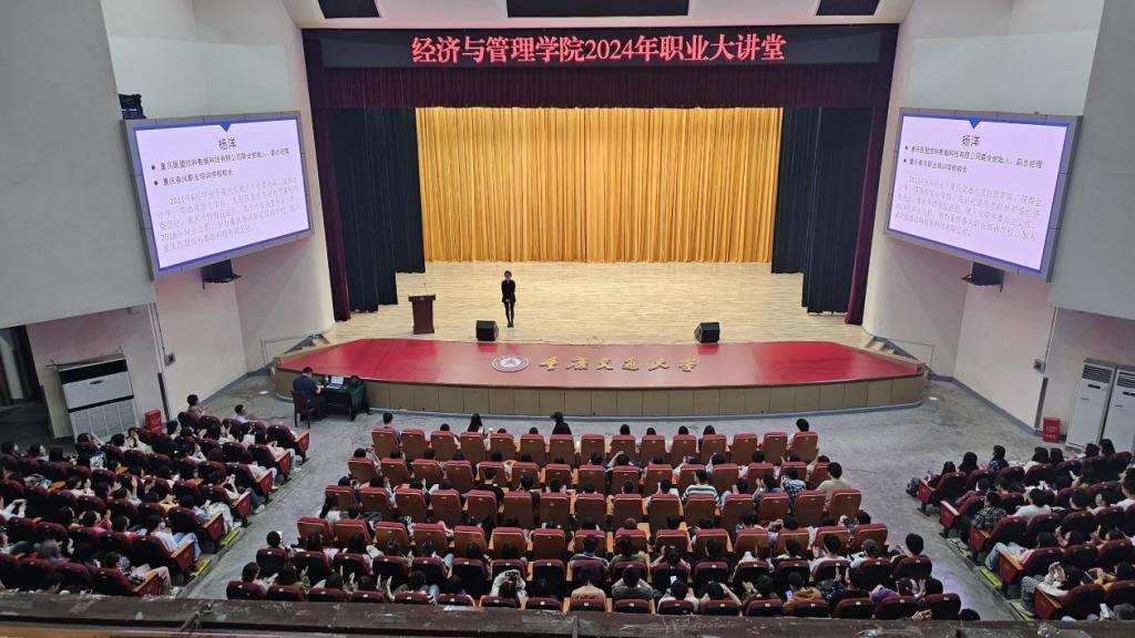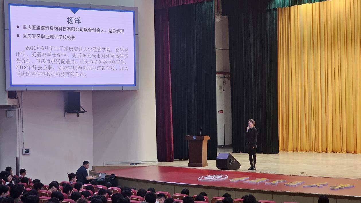 在讲堂上,杨洋员工首先回顾了自己的学习经历和职业生涯,她从自身经历出发鼓励同学们要敢于面对挑战,同时也要注重自我提升和不断学习,以适应不断变化的就业市场。同时,她结合自己在重庆市有关部门工作、辞职创业等职场经验和创业经历,为同学们解读了当前就业市场特点、职场趋势和人才需求等情况。