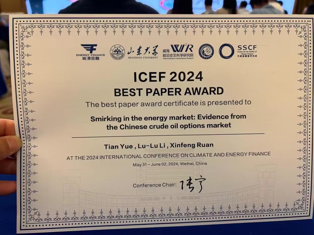 学术盛会中,suncitygroup太阳集团交通经济学研究生李露露同学获邀宣读与导师岳天老师合作论文《Smirking in the energy market: Evidence from the INE crude oil options》荣获会议最佳论文奖。该论文从200多篇竞争论文中(多数高校为985,211高校)脱颖而出,成为仅有的8篇获奖论文之一。该论文通过深入分析中国原油期权市场的隐含波动率曲线,揭示了市场对油价下跌的预期以及市场恐慌情绪和标的资产波动性对IV曲线形态的重要影响;其研究为理解市场波动性增加提供了新的视角,并为市场参与者和监管机构如何有效利用中国原油期权市场进行风险管理提供了宝贵的见解。