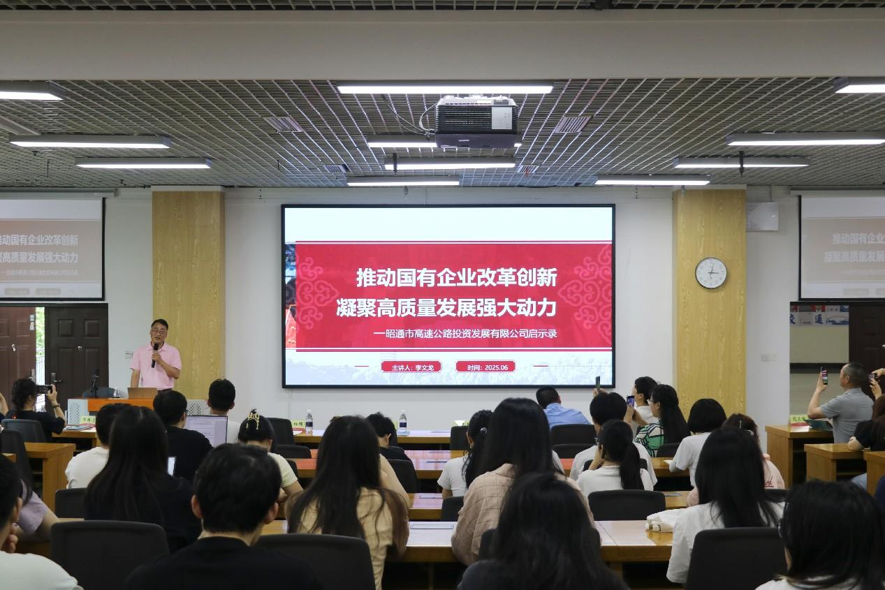 在主题讲座环节,李文龙以《推动国有企业改革创新 凝聚高质量发展强大动力》为题,生动讲述了“国有企业改革创新与昭通高速公路投资发展实践”的“故事”:以党建引领破解治理难题,以市场化机制激活内生动力,以技术创新突破条件约束,为企业高质量发展注入持续动力。他系统梳理了我国国企改革的历史脉络,并以昭通市高速公路投资发展有限公司为案例,深度剖析了其如何在资源禀赋相对薄弱的背景下,成功破局发展,推动昭通从“交通末梢”跃升为“滇川黔区域综合交通枢纽”。