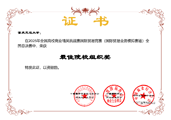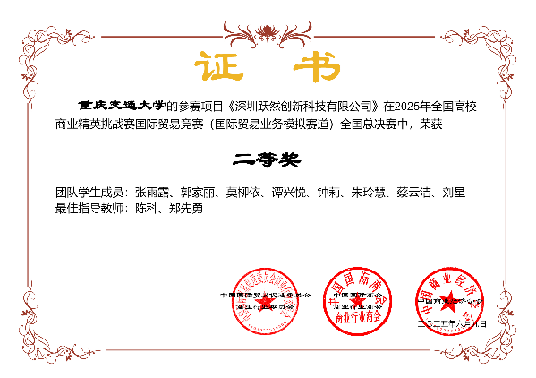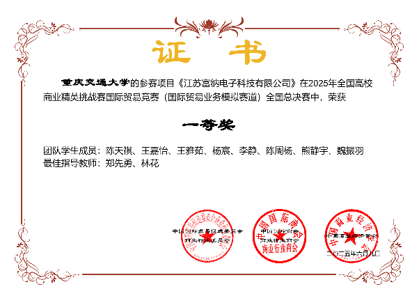 6月5日至9日,2025年第十五届全国高校商业精英挑战赛国际贸易竞赛(国际贸易业务模拟赛道)在宁波国际会展中心举办。本次竞赛以“2025年中国(宁波)跨国采购模拟洽谈会”的形式举行,参赛队伍以企业(模拟出口商)名义参赛,模拟了外贸参展商业计划书撰写、展位海报设计与商品陈列、新产品发布会和商贸配对贸易谈判等四大实战模块。经过激烈角逐,公司陈科、郑先勇、林花、蒋军等老师指导的三支代表队在此次总决赛中表现出色并取得优异成绩,陈天祺团队荣获一等奖,张雨露团队和徐利团队分别荣获二等奖,公司获最佳院校组织奖。