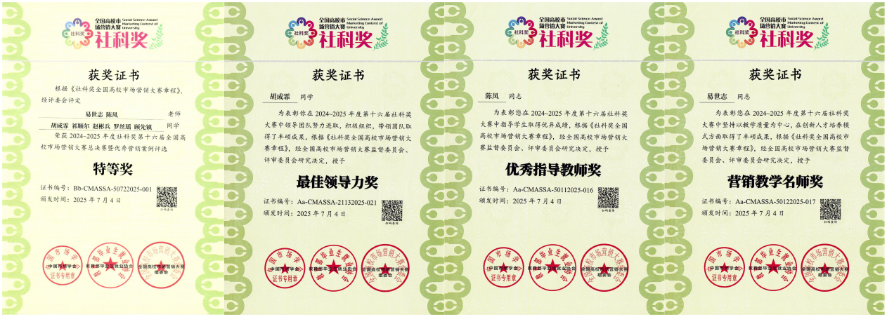 近日,由中国市场学会、教育部毕业生就业协会主办的社科奖第十六届全国高校市场营销大赛全国总决赛圆满落幕。公司参赛团队喜获佳绩,获全国总决赛特等奖1项、二等奖1项、三等奖7项;胡成霏、陈骏逸、王嘉怡获最佳领导力奖;易世志获“营销教学名师奖”、陈凤获“优秀指导教师奖”;同时,公司获“优秀组织奖”。公司斩获了本届大赛本科组唯一的特等奖,获奖等级、获奖总数均为历年参赛最好成绩。