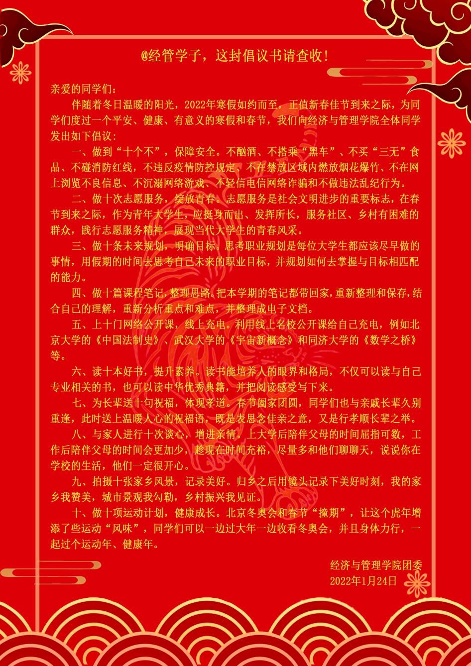 为提高经管学子的防疫意识、安全意识,度过一个安全、祥和的寒假,共享温馨祥和的春节。suncitygroup太阳新城团委向全体经管学子提出倡议,希望员工明确假期中学习、活动任务;知晓假期中生活、防疫要求;杜绝各类危险隐患,快乐平安过春节;开心、愉快过寒假。