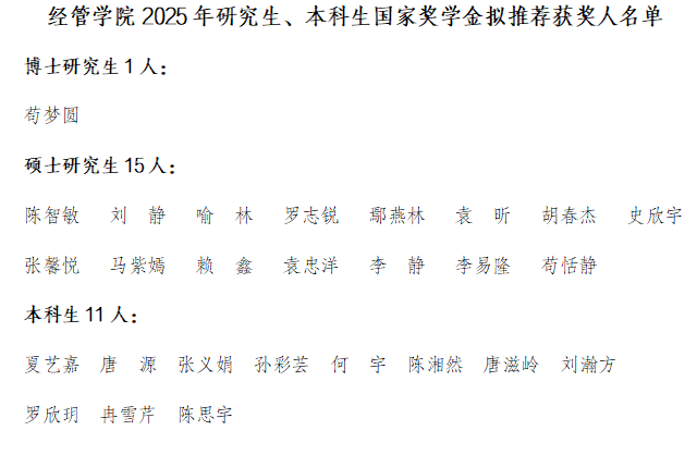 根据重庆市财政局、市教委和公司有关文件精神,经员工本人申请、公司国家奖学金评审委员会初审,拟推荐苟梦圆等16名同学为2025年研究生国家奖学金获奖员工,夏艺嘉等11名同学为2025年本科生国家奖学金获奖员工。现将推荐获奖名单进行公示,如有异议,请在公示期内与suncitygroup太阳新城员工工作办公室、suncitygroup太阳新城纪委联系。