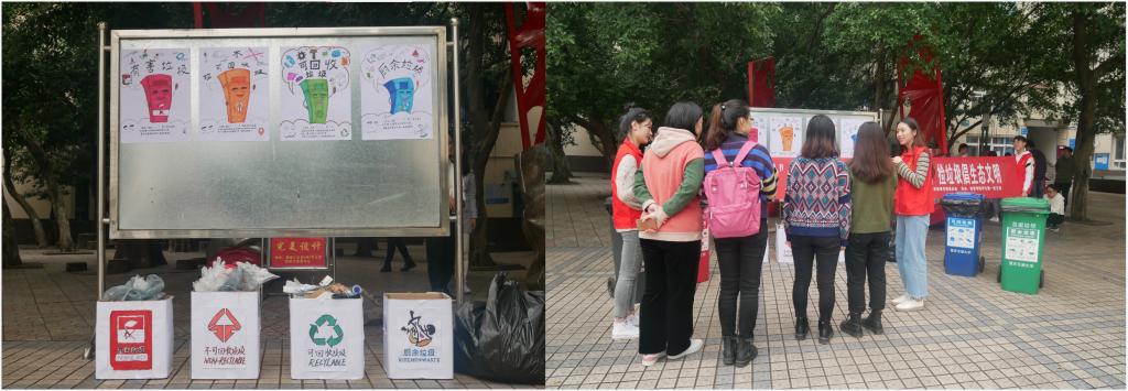 志愿者手工DIY的垃圾分类宣传画展示 志愿者向同学宣讲垃圾分类知识
