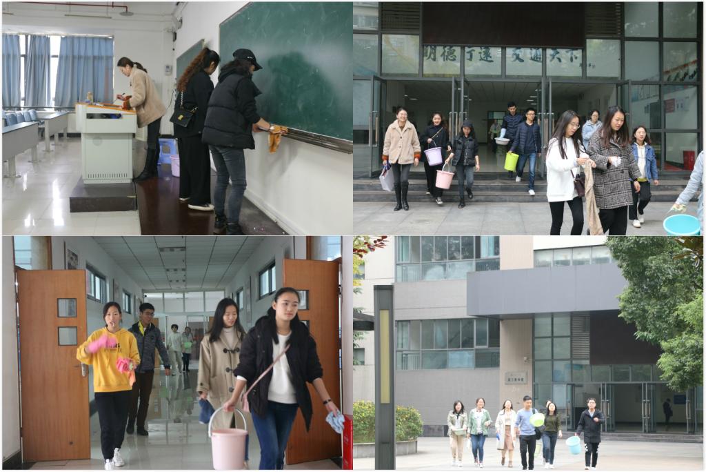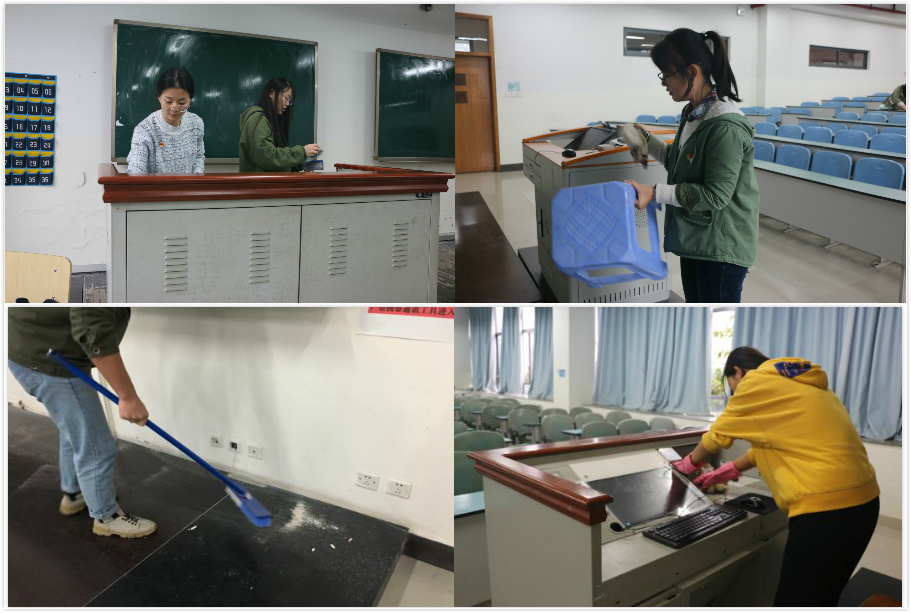 活动伊始,张老师通过阐述活动背景、流程、意义等,组织动员大家以小组为单位分配任务。从一楼到六楼、从三教到二教,志愿者们先用板擦擦掉黑板上的字迹,然后用湿润的抹布将黑板从上到下擦干净,同时将板槽内的粉笔灰扫出,让讲台变得焕然一新。在彼此间的互相帮助下,各自怀着服务与奉献的精神用勤劳的双手擦亮一面面黑板,同时也擦亮了一面面传授知识的墙,扫净了一座座传递爱心的桥梁。