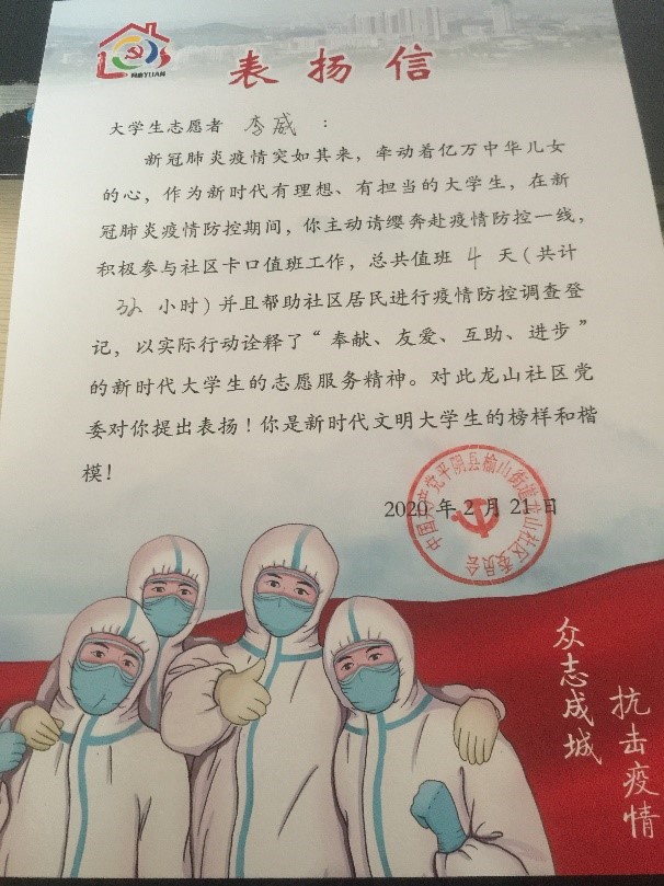 图1 当地社区为李威同志颁发的老员工志愿者表扬信