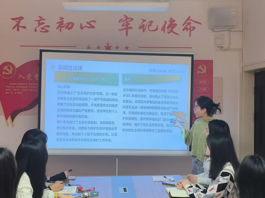 实践团队返程后举办“践行两山理论·守护缙云青绿”主题分享会,通过“政策解码+调研报告+法治宣讲”三维研讨深化认知。员工党员冉瑞鹏解读党的二十届三中全会生态治理方略,结合两会热词剖析生态产品价值实现路径;马一斐、张佳雯结合专业知识创新采用“案例推演+法条竞答”形式,以缙云山山火为切入点,深度解析《中华人民共和国森林法》第38条等法规在生态屏障建设中的实践应用,现场模拟生态损害赔偿诉讼流程,引发师生对“生态法治中国”的热烈讨论。