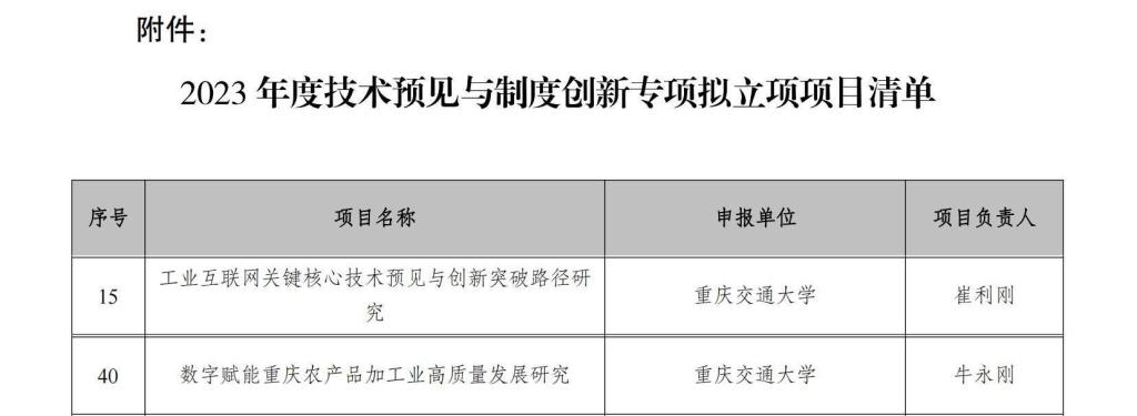 近日,经市科技局2023年第17次局长办公会审议,重庆市科技局公布《2023年度技术预见与制度创新专项拟立项项目清单公示》。公司崔利刚和牛永刚两位教师喜获立项。