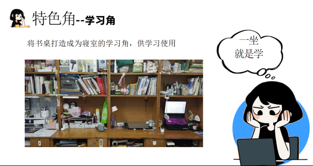 9-141是由3名市场营销专业员工和1名会计专业员工组成的女生寝室,员工党员何馨月是该寝室成员。该寝室充分结合自身情况,打造了“学习角”和“心理角”两个特色角。学习上大家在“学习角”交流学习心得,共同进步;生活上大家在“心理角”放松休息,排解压力,学习氛围十分浓厚。