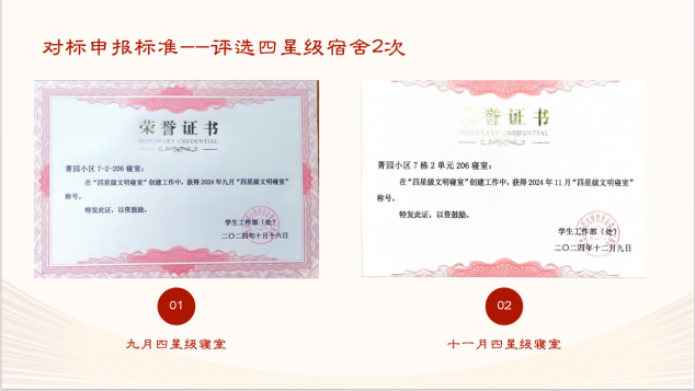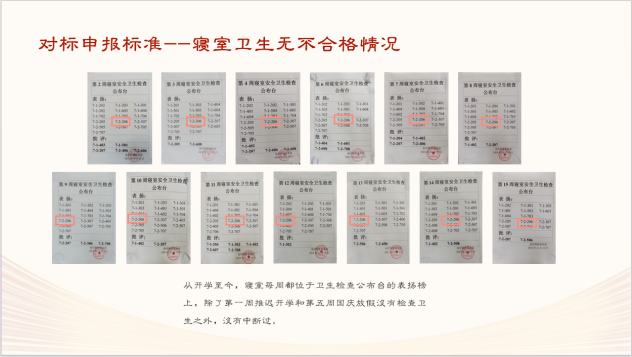 7-2-206是由12名专升本员工组成的男生寝室,员工党员冉瑞鹏担任室长。自9月组建以来,该寝室团结一致,互相督促,良好地适应了新环境的学习和生活,并被评为四星级文明寝室2次,寝室卫生检查公布台表扬17次,为营造良好的生活环境树立了标杆。