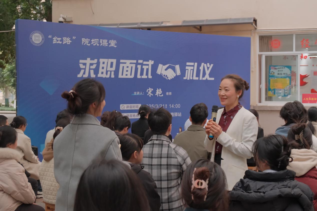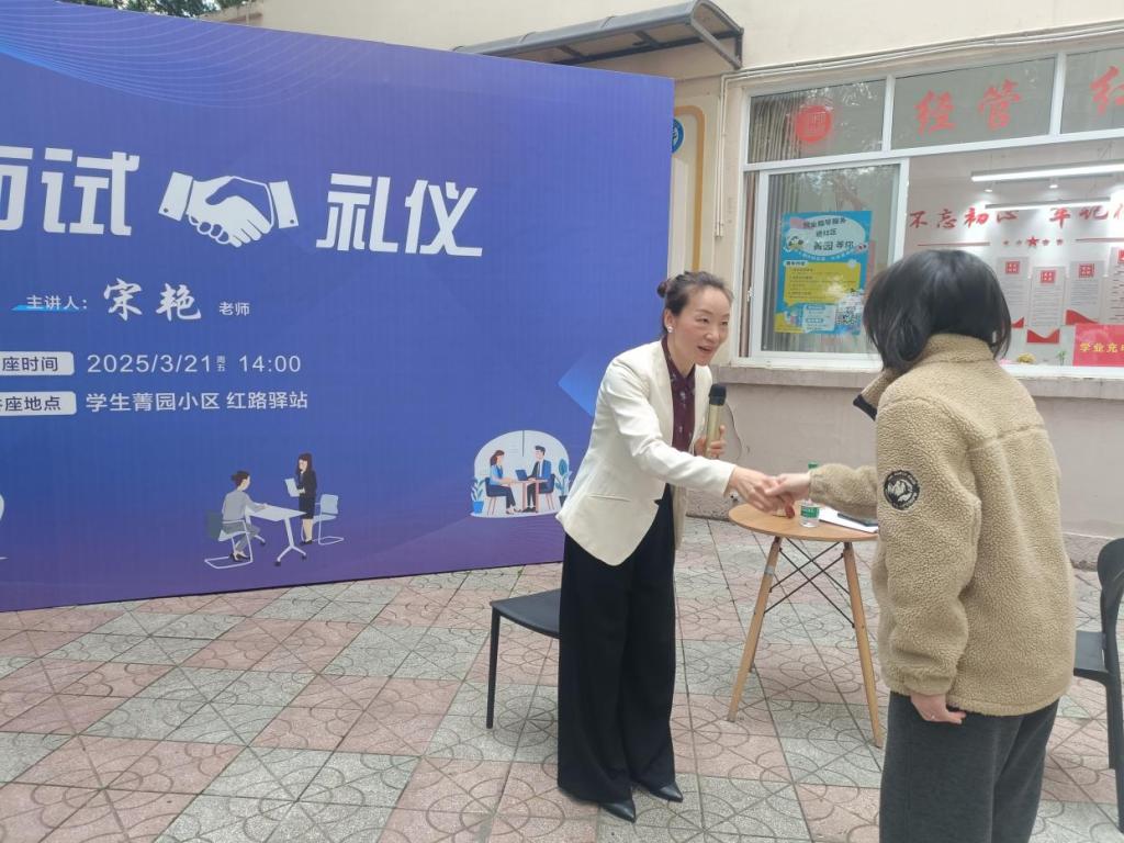 suncitygroup太阳新城在菁园社区“红路”驿站举办专题职场礼仪培训活动。主讲教师宋艳以“求职面试·礼仪”为主题,通过理论讲解与情景演练相结合的方式,为即将步入职场的学子们传授实用技能,揭开了职场礼仪的深层密码。