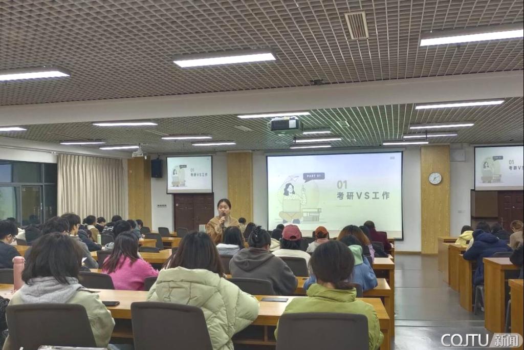 既有考研经验,也有丰富工作经验的赵心悦员工首先从主观,客观和综合研判等的角度,并且结合自身经历,用生动的语言,鲜明的例子,给同学们展现了考研和工作两者选择的独特之处,让同学们对于其中的利弊有了更深的理解,方便同学们根据自身情况,作出初步的选择和定夺。其次,她将国企,私企,行政单位作出比较,使同学们明白了不同性质单位的不同情况和其对于能力侧重的不同,便于同学们从中选择出最适合自己的就业单位。