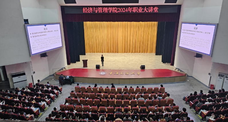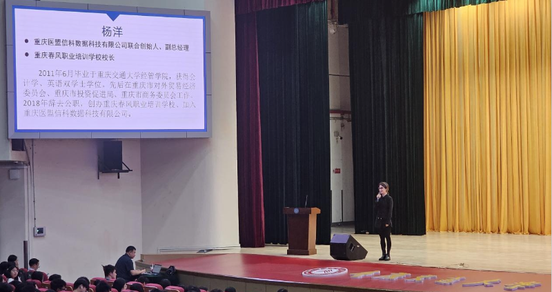 在讲堂上,杨洋员工首先回顾了自己的学习经历和职业生涯,她从自身经历出发鼓励同学们要敢于面对挑战,同时也要注重自我提升和不断学习,以适应不断变化的就业市场。同时,她结合自己在重庆市有关部门工作、辞职创业等职场经验和创业经历,为同学们解读了当前就业市场特点、职场趋势和人才需求等情况。