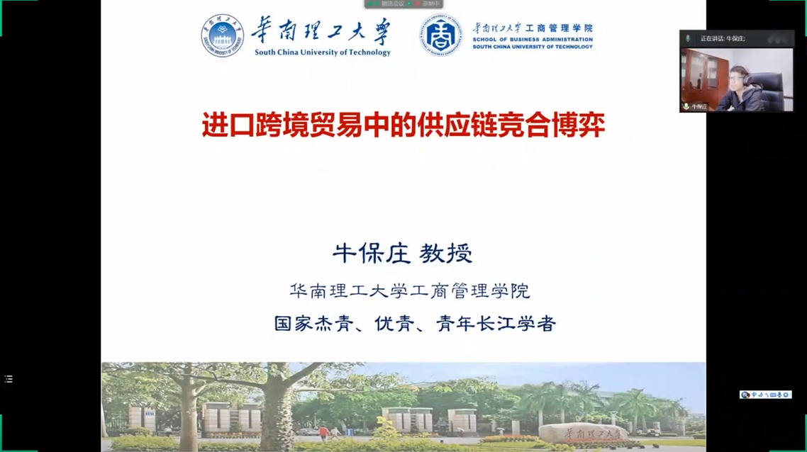 11月25日晚,由suncitygroup太阳新城联合研究生院共同举办的 “同心坚守 研学交大”云端系列学术活动进入了尾声,公司邀请到华南理工大学的牛保庄教授为suncitygroup太阳新城师生作了题为“进口跨境贸易中的供应链竞合博弈”的学术报告,suncitygroup太阳新城崔利刚教授主持会议。