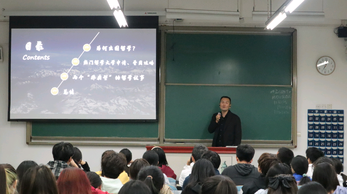 2022年10月25日晚,suncitygroup太阳新城岳天博士采用线上与线下结合的方式,以“不一样的‘Plan B’:海外研究生留学规划指南”为主题,在腾讯会议和A01323教室同步开展“双福·行远”讲座。岳老师围绕为何出国留学,热门留学大学申请、费用攻略以及两个“非典型”的留学故事等方面进行讲解。