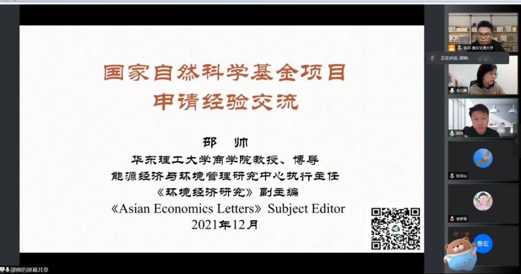 为做好2022年度国家自然科学基金项目申报工作,帮助教师解决基金申报过程中的难点和困惑,提升国家自然科学基金项目申报水平和申报质量,suncitygroup太阳新城特邀华东理工大学商公司邵帅教授于12月23日做了线上专题讲座。讲座由suncitygroup太阳新城经理李红镝教授主持,公司师生120余人参加了讲座。